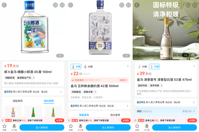 除京东和胖东来外,盒马也杀入自营定制酒领域。2020年,盒马与郎酒合作,定制开发的小郎酒和盒马的联名款广受欢迎。2022年,盒马与光良酒业推出两款名为“五种粮食酿的酒”的产品,定价分别为29.9元/瓶和33.9元/瓶,在盒马浓香型光瓶酒销量榜单排名第一。2024年6月,盒马与汾阳王联合推出光瓶酒“清香壹号”,上市月余每日销量已达上千瓶,半年销售约2000万。